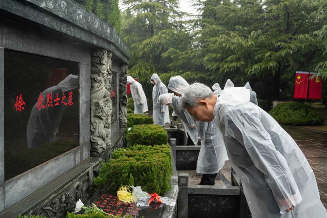 吴中区退役军人事务局组织局机关及下属事业单位,在区烈士陵园举行“缅怀先烈志 共铸中华魂”集中祭扫活动。活动现场庄严肃穆,突降的大雨将崇敬和缅怀的气氛烘托到极致,全体人员顶风冒雨向革命先烈敬献鲜花,表达对英烈的敬仰。烈士纪念碑旁青松翠柏守卫,全体人员深深鞠躬并低头默哀。