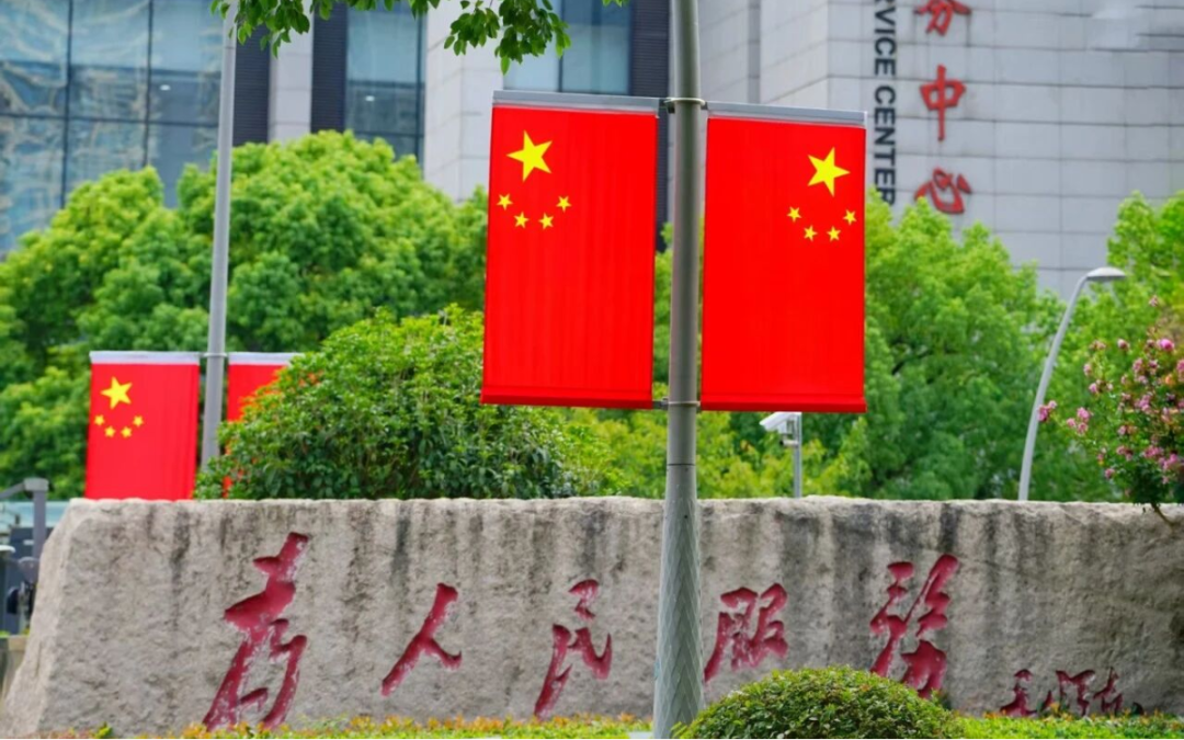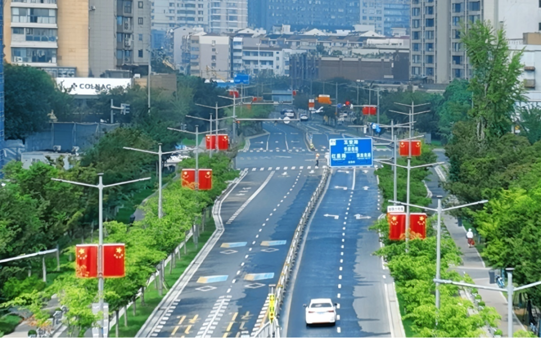 市级重点道路蔚为壮观!中山路、人民路、太湖大道等5条重点道路上无数面国旗构成磅礴的红色方阵,整齐划一,迎风招展。它们以中流砥柱的笔挺身姿,勾勒出城市最庄严的天际线,不仅树立了悬挂标准的典范,更奏响了国庆盛典的雄壮序曲。