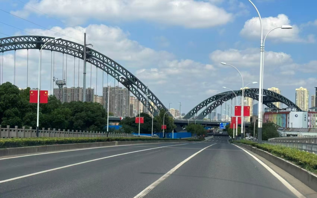 新吴区在长江路、机场路、雪梅路等67条重点道路悬挂国旗,科技新城主干道红旗飘扬,现代感十足的灯光悬挂与“中国红”碰撞,展现活力新城的爱国热情。