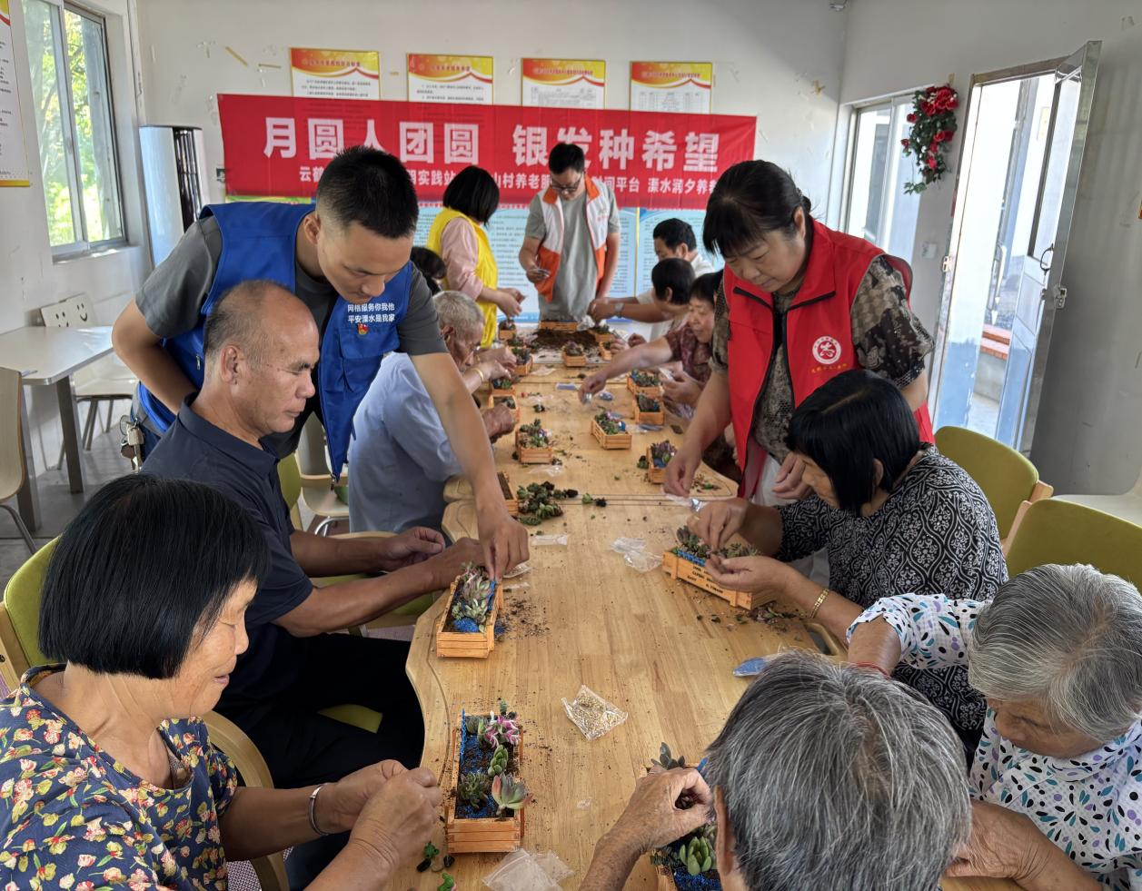 晶桥镇陶村、杭村、枫香岭、芮家、新桥、芝山村、云鹤山村等多个村(社区)则聚焦“动手体验”,让老人在创作中感受节日乐趣。陶村社区新时代文明实践站选择无需烘烤的冰皮月饼方案,志愿者“一对一”协助老人揉皮、包馅、压模,精致月饼诞生时,老人们脸上满是自豪。云鹤山村以“月圆人团圆 银发种希望”为主题,组织老人种植多肉微景观,在团圆氛围中播撒绿色希望。芮家社区开展中秋活动,深化邻里友谊;新桥社区志愿者讲解漆扇工艺历史与中秋民俗,引导老人绘制玉兔、桂花等元素的漆扇,既锻炼手脑协调,又激发对传统技艺的兴趣。此外,枫香岭社区的“巧手做月饼”活动,也让村民在揉制烘烤间品味中秋滋味。