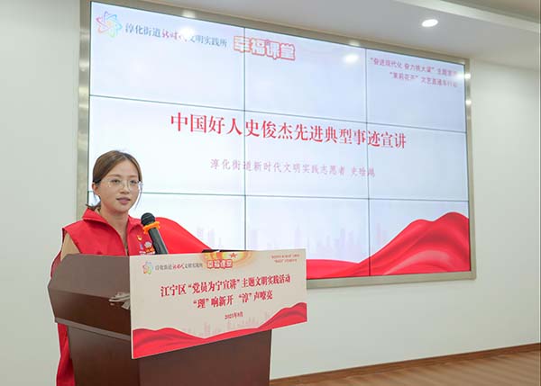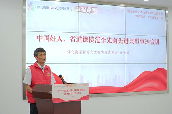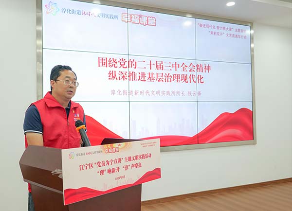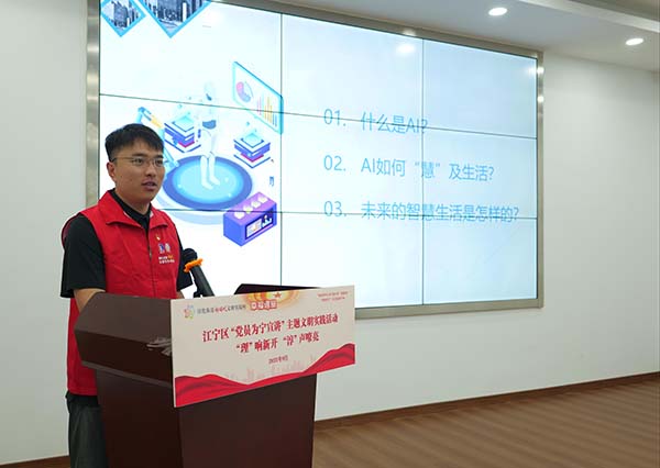 在“‘理’响新开,‘淳’声嘹亮”宣讲环节,多位党员志愿者轮番登台,带来一系列贴近民生、实用性强的主题分享。淳化街道新时代文明实践所所长钱云锋围绕党的二十届三中全会精神,结合街道实际进行深入解读;区科技局党员志愿者周岩以“AI科普‘慧’生活”为主题,生动介绍人工智能在日常场景中的应用,助力群众跨越“数字鸿沟”;区司法局党员志愿者虞静系统讲解公共法律服务内容,结合真实案例解析依法维权路径;区教育局党员志愿者李舒婷聚焦家庭教育难题,传授“非暴力沟通”四步法,为亲子关系“把脉开方”。