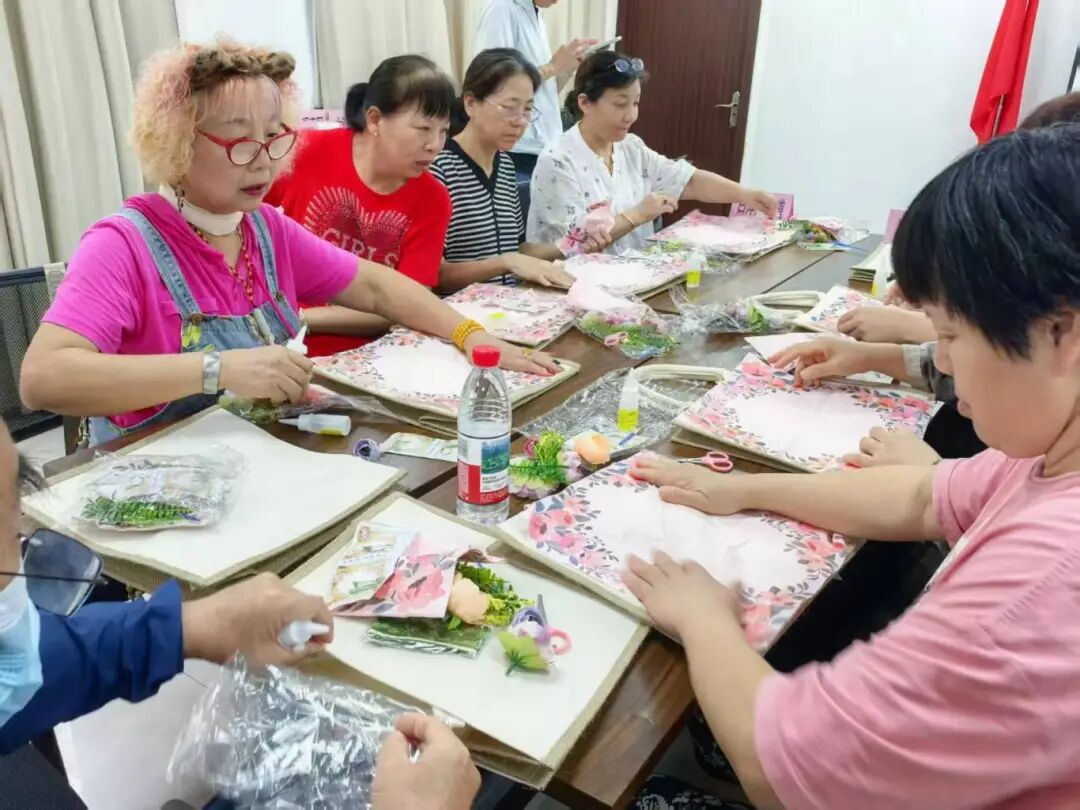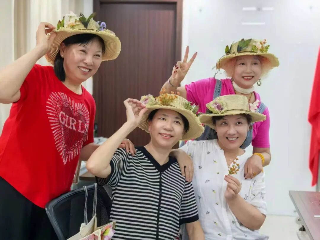 干花草帽创作环节带领老年人深入了解这一非遗民俗工艺。在专业老师指导下,大家精心挑选素馨、桃花、荷花等传统花卉素材,有条不紊地完成剪枝、抹胶、铺花、镶嵌等步骤,将吉祥寓意融入独特花型,制成兼具美观与纪念意义的干花草帽,让非遗技艺在指尖“活”起来。