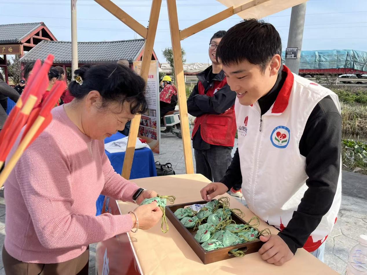 广场四周,形式多样的志愿服务摊位构成了一个充满温情的“便民集市”。在免费理发摊位前,让爱启航公益团队的志愿者们手中的剪刀上下翻飞,一位位老人片刻间便焕发出清爽的精神面貌;中国移动的志愿者则在耐心辅导老人如何与远方的儿女视频通话;传统文化摊位也吸引了大量群众参与,体验重阳节佩戴香囊、品尝重阳糕等习俗。此外,市中级人民法院、淮安海关、区司法局、区医保局等单位也分别设立了服务点,为村民提供普法宣传、卫生知识讲解、法律咨询和医保政策解读等服务。 一个个“红马甲”穿梭在人群中,成为秋日里最温暖的风景。
