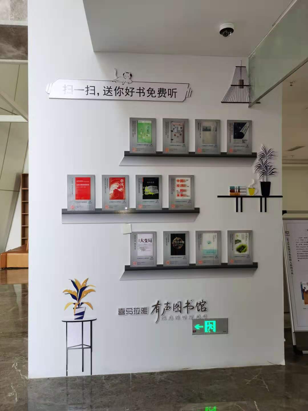 在电子阅览台旁边,是喜马拉雅有声图书馆。喜马拉雅有声图书馆内设传奇故事、脱贫致富、历史人文、养生智慧和红色经典等10余个模块,以“一本实体书+一个二维码”的方式,为读者提供畅销图书、生活百科、健康养生等海量音频资料,将传统的纸质图书变为电子有声读物。