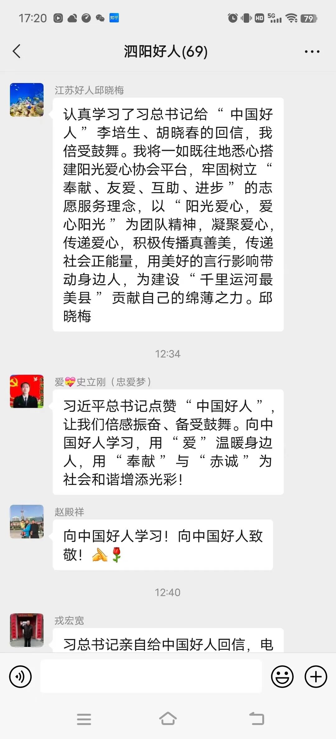 “习近平总书记亲自给‘中国好人’回信,电视新闻看了,报纸也读了,使我感动、激动。我作为新当选的‘江苏好人’深感自已今后的责任更大”“习近平总书记点赞‘中国好人’,让我们倍感振奋、备受鼓舞。向‘中国好人’学习,用‘爱’温暖身边人,用‘奉献’与‘赤诚’为社会和谐增添光彩!”“从点滴做起,对标好人,弘扬好人精神,凝聚奋进力量。”……泗阳好人群里的道德典型争相发言,纷纷表示要发挥好榜样作用,积极传播真善美、传递正能量。
